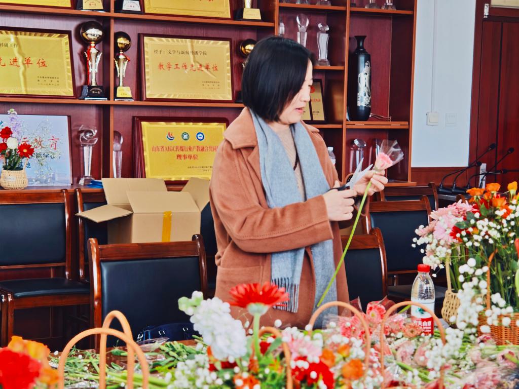 活动现场欢声笑语,春意融融。在艺术插花区域,教职工们发挥创意,将玫瑰、康乃馨、向日葵等花材精心搭配,制作出一个个象征美好与祝福的花篮。“插花是心灵的对话,今天不仅学到了技艺,更感受到生活的诗意。”老师捧着自己的作品感慨道。 串珠制作区则是一片专注的氛围,彩色琉璃珠在指尖流转,化作精致的手链、挂饰。大家互帮互助,分享配色心得,原本零散的珠子逐渐串联成独一无二的艺术品。而古法艾草锤手工体验更是别具匠心,教职工们填充艾草、捆扎棉布,制作出兼具传统养生智慧与实用价值的健康锤。“自己做的艾草锤,既能按摩肩颈,又能感受中医药文化,太有意义了!”王老师兴奋地展示成果。