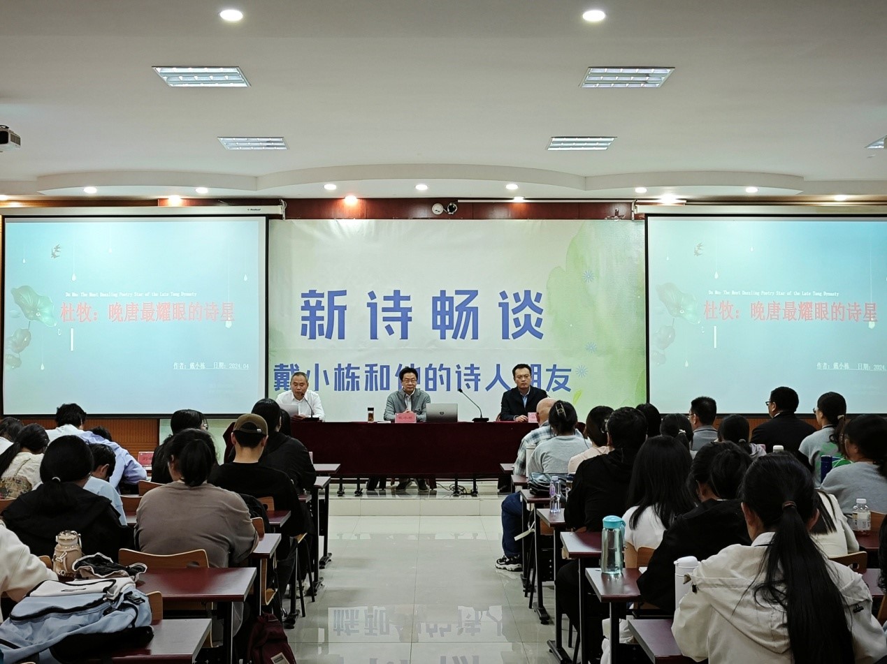 报告前公司蒋涛涛副董事长代表太阳集团tyc151cc聘任戴小栋为太阳集团tyc151cc文学与新闻传播公司兼职教授。随后戴教授以《杜牧——晚唐最耀眼的诗星》为题,向在场师生作了精彩的报告。戴教授从诗人的生平讲起,分析了杜牧的人生境遇对其品格和诗歌的影响,并以其生平为主线,通过讲解杜牧人生的三处福地,带领师生赏析杜牧不同时期的诗歌作品,归纳出杜牧诗歌的艺术特点。报告基于确凿的史料分析,既有感兴的诗性体验,更有理性的学术表达,有宏观视野的探究,也有微观文本的关注,全面而立体化地展示了晚唐杰出诗人杜牧的文学价值。