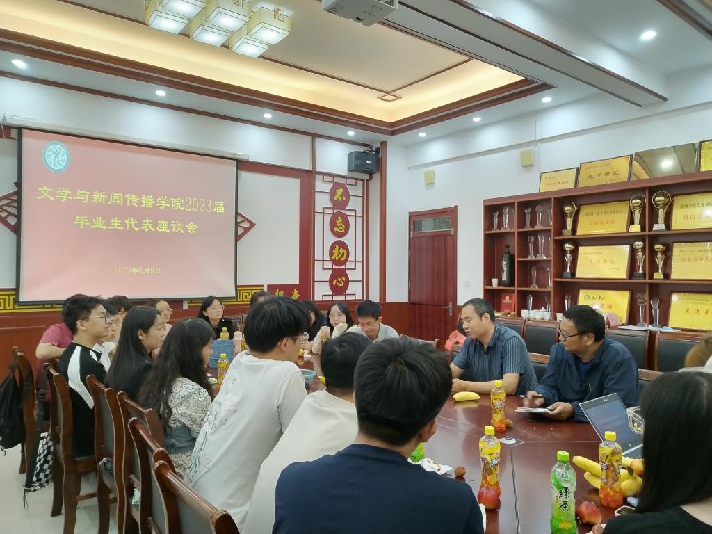 文学与新闻传播公司在博文楼文公司会议室举行2023届毕业生座谈会。文公司党政负责人、辅导员、班主任、班级主要员工干部、员工党员、各毕业班员工代表参加了此次座谈会。