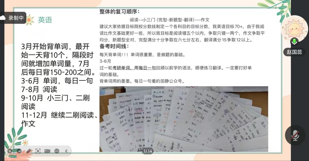 交流会上,5位学长学姐结合自身考研经历,围绕择校定位、初试备考、复试技巧、调剂策略等核心环节,进行了细致深入的分享,内容兼具实用性与针对性,干货满满。学科语文专业的赵国蕊学姐,全面分享了她从专业与院校确定、各科备考(政治、英语、333、专业课)到复试准备的全流程经验,为学子们搭建了清晰的备考框架;现当代文学专业的韩冰学姐,聚焦院校选择的核心逻辑,结合自身情况讲解如何科学择校,并详细拆解了英语、政治、文学基础等科目的备考规划,强调了分阶段复习的重要性;同属现当代文学专业的高国瑶学姐,重点分享了自身调剂经历,着重强调复试备考需回归专业基础、拓宽学术视野,并毫无保留地介绍了调剂信息的搜集与筛选方法,为有调剂需求的学子提供了宝贵参考。新闻传播专业的王美涵学姐,同样以复试与调剂为核心,详细讲解了复试全流程细节、面试应答技巧,并总结出调剂“找公司、筛公司、报公司”三步走的实操建议,极具指导性;国际中文教育专业的郦一诺学姐,介绍了上海大学相关专业的招生情况,分享了“效率为王”的备考原则,同时针对公共课及汉语基础、文化要略、教学论等专业课,提供了高效实用的复习方法,为瞄准同类院校和专业的学子指明了方向。