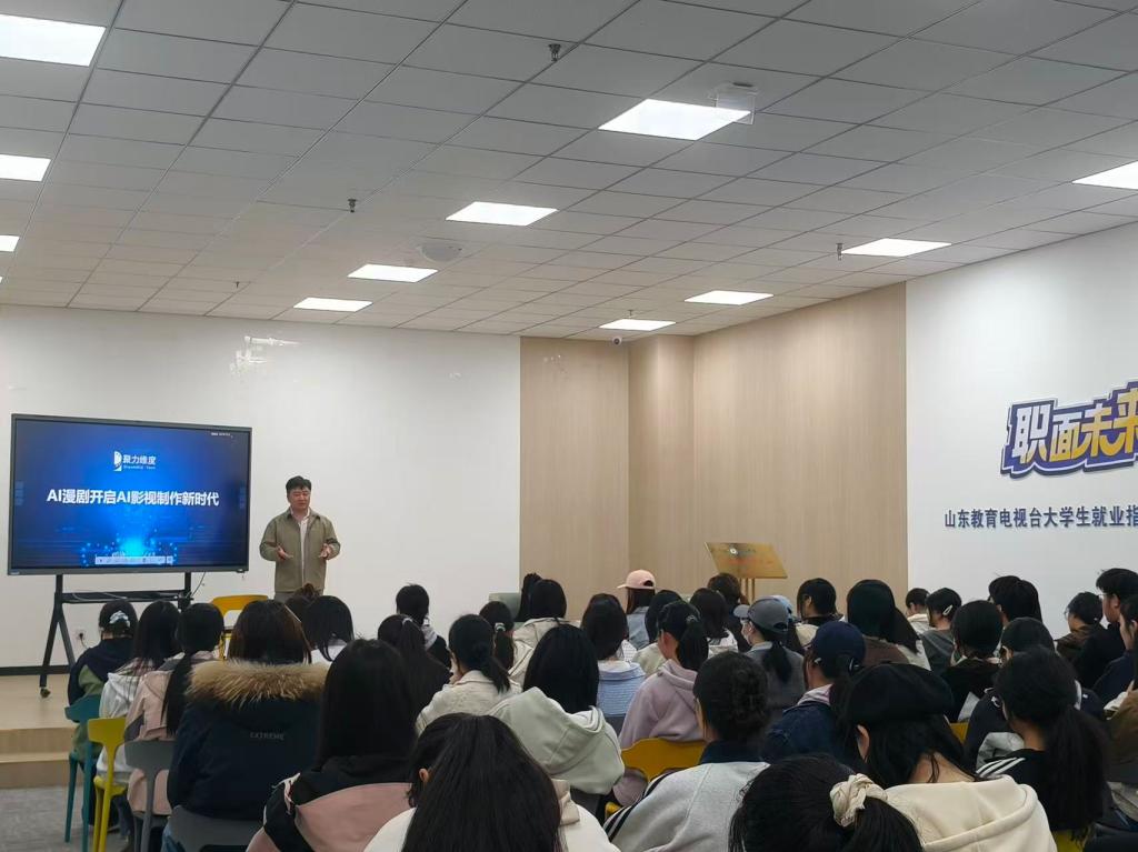 宣讲现场,聚力维度的企业代表给大家详细介绍公司情况,重点分享AI精品短剧赛道的行业前景,还讲解了企业的市场优势、技术优势、赛娲大模型的核心能力与未来发展规划,让同学们直观了解到AI+3D影视制作领域的发展潜力。针对太阳集团tyc151cc同学的专业特点,企业代表还专门介绍了适配岗位的招聘需求、岗位职责和职业发展路径,耐心解答大家关于实习、薪资、成长通道等问题,现场交流氛围十分热烈。