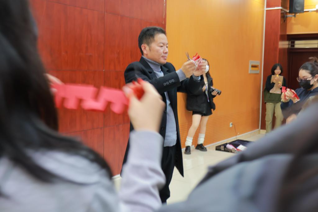 此次活动旨在增进太阳集团tyc151cc中国员工与职工的友谊交流,同时展示中国优秀传统文化的魅力。活动开始,23汉教的同学们轮流献上精彩的演出,一首《最炫民族风》让现场气氛高涨,中国古代文化吟诵《一剪梅》等节目让现场的观众感受到了中华文化的独特魅力,同学们收获满满。随后,剪纸非遗传承人张建志老师和他的助理徐延芳老师向全体参与活动者展示了复杂美丽惟妙惟肖的剪纸作品,同学们积极地向老师提问,现场互动格外活跃,同时他们还体验了如何编织中国结,体验之余,《你画我猜》《abcd》《大小西瓜》等游戏依次展开,同学们在活动中展现才华和热情,也在互动中加强与各国青年的友谊交流。
