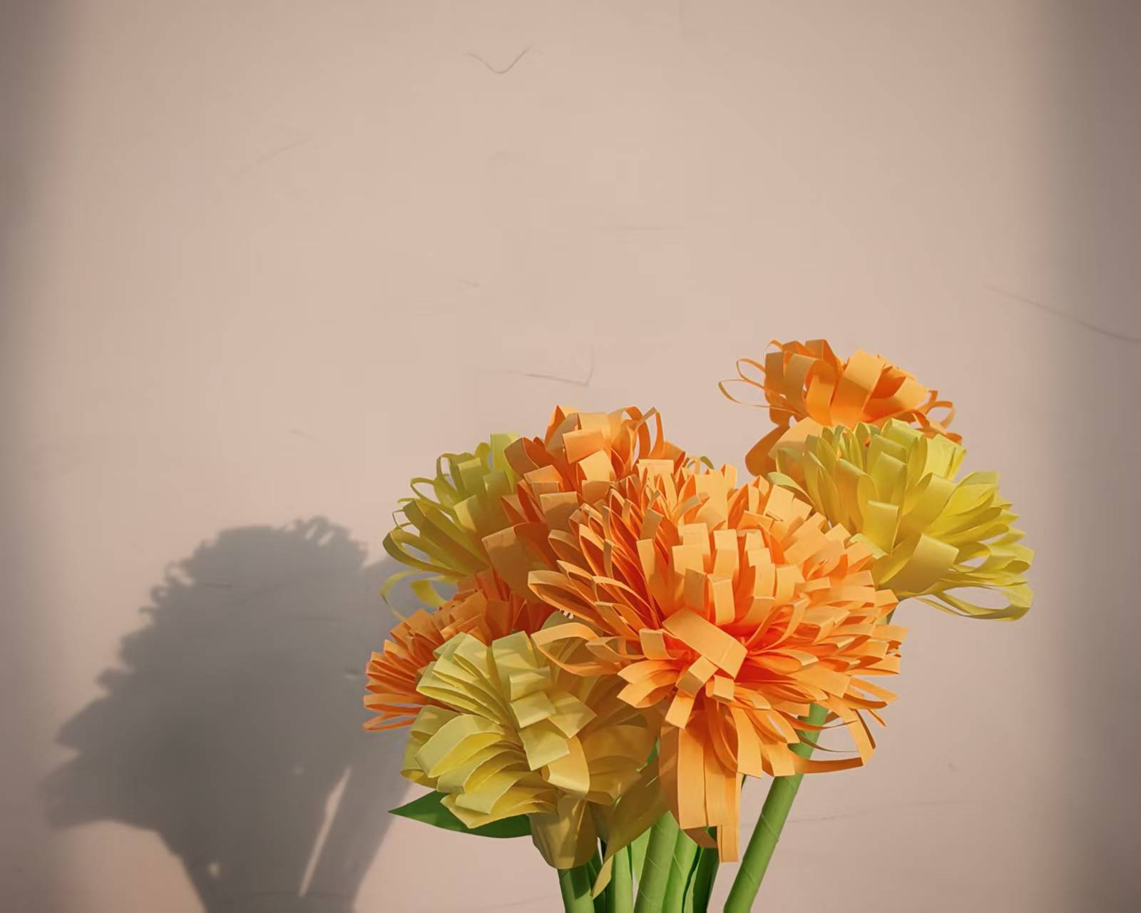 在充满传统意趣的氛围中,同学们手持彩纸与剪刀,投入菊花剪纸的创作。大家细致观察菊花的形态,在纸上勾勒出花瓣轮廓,再沿着线条精心剪裁。通过层叠、镂空等手法,原本平整的彩纸渐渐绽放为一朵朵寓意吉祥的剪纸菊花。在作品分享环节,同学们不仅交流剪纸心得,更结合重阳文化内涵,讲述各自对“敬老”与“团圆”的理解。一件件剪纸作品,成为传递情感与祝福的媒介,也让节日的温暖在言笑间静静流淌。