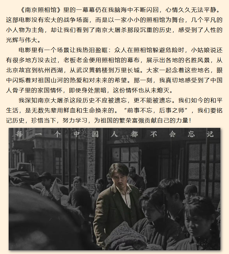 活动自开展以来,各班积极宣传动员,同学们踊跃参与,在观看影片后认真撰写感悟,抒发真情实感。影片通过南京一家小小照相馆里平凡人物的故事,折射出南京大屠杀那段沉痛历史,展现了危难中人性的光辉与坚韧不拔的家国情怀。同学们在感悟中纷纷表示,历史不容忘却,和平来之不易。其中,郭思语同学在观后感中动情地写道,影片里众人借助幕布“云游”祖国山河、共念地名的一幕,深深触动了她,让她感受到深植于血脉中对家国的热爱与在黑暗中不灭的希望。大家纷纷在感悟中表示,铭记历史是为了更好前行,当代青年更应珍惜当下,奋发学习,为祖国建设贡献力量。