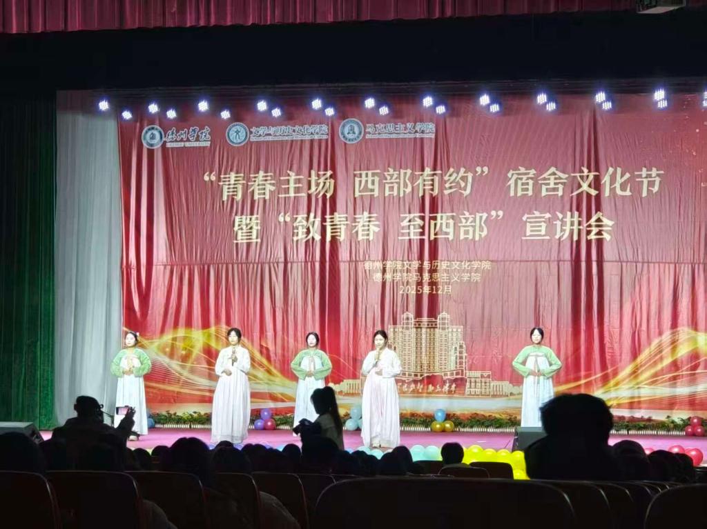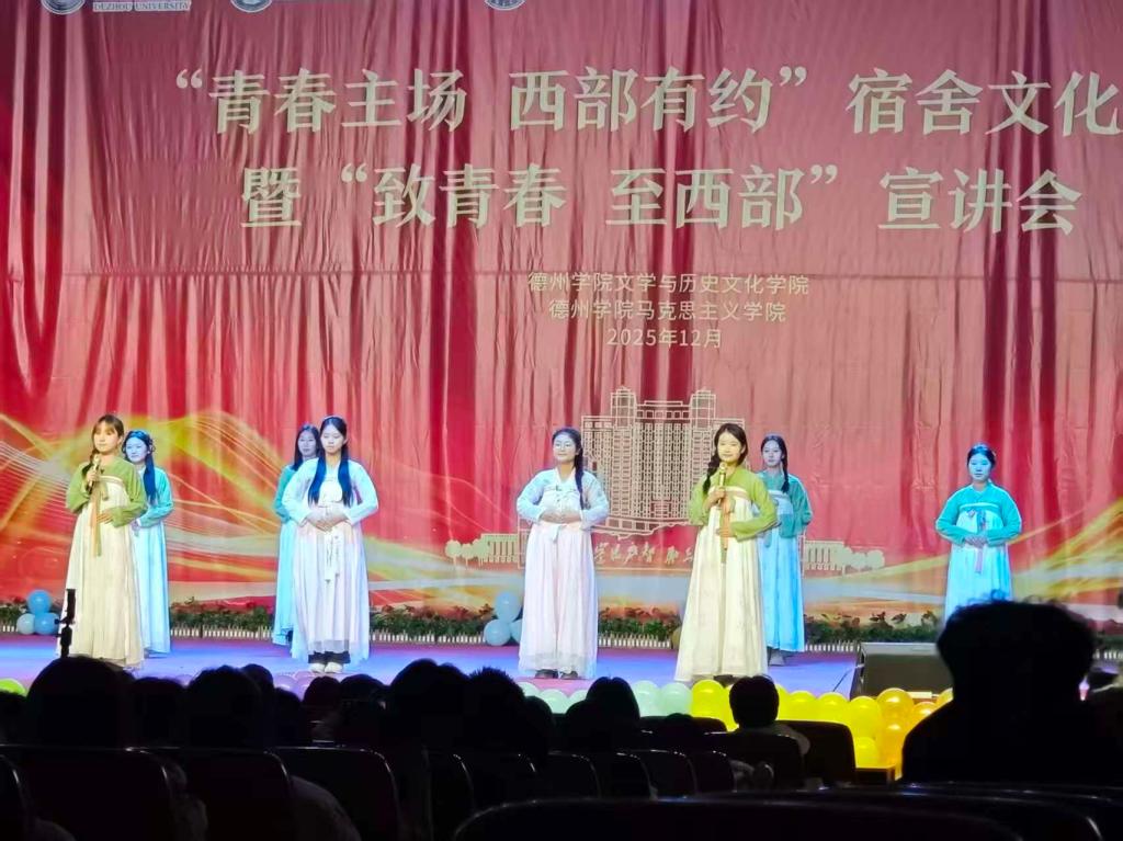 在校园文化展演及市级赛事中,柳湖吟诵社多次精彩亮相。社团先后参与“青春主场,西部有约”宣讲会与德州市青春诗会,演绎《长干行》《桃夭》《子衿》等经典作品,通过专业的吟诵表演生动传达诗词意境,展现出德院学子传承中华优秀传统文化的风采。