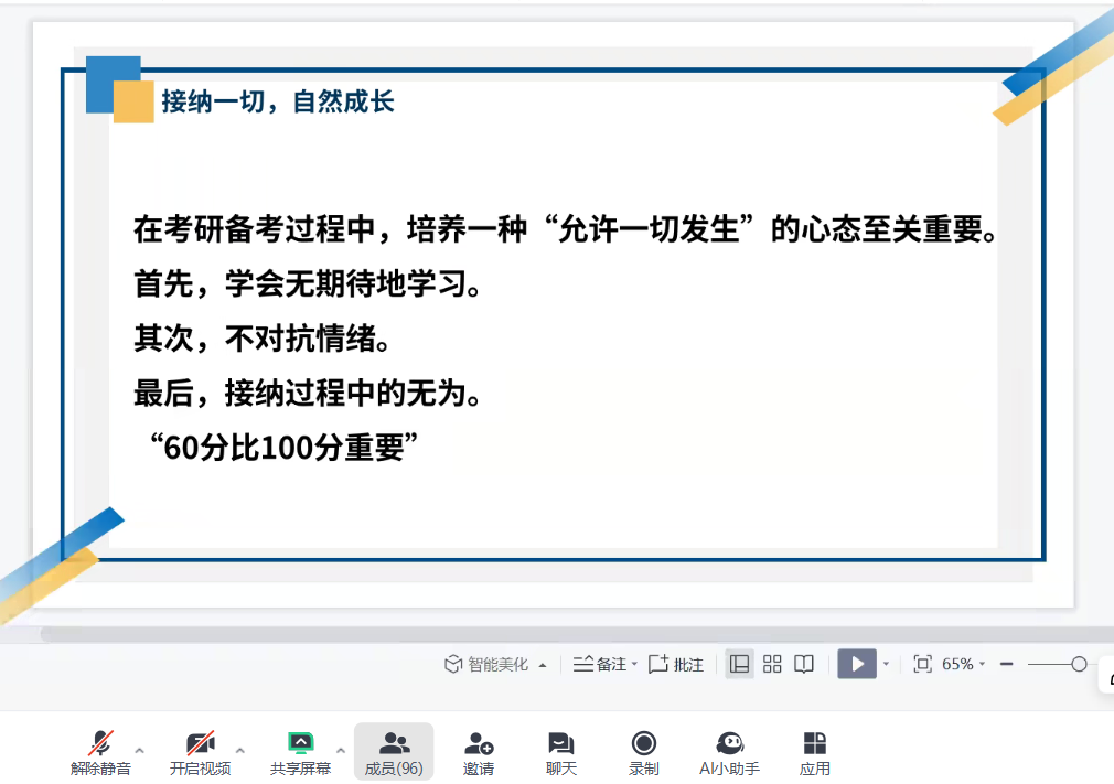 为做好2025年研究生复试、调剂服务工作,帮助考研学子更加充分地做好复试准备,1月22日,太阳集团tyc151cc线上举办考研复试、调剂经验交流会。副经理马超主持会议,考研辅导教师俞泽峰、黄雯、刘希云、李冬英等现场为员工们做考研事宜的解答,并有近100位员工积极参加活动。