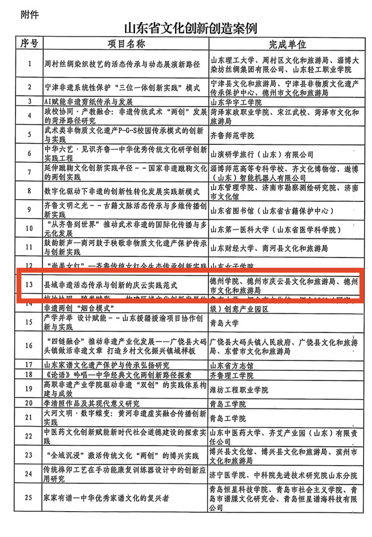 近日,山东省文化和旅游厅公布山东省文化创新创造案例名单,公司党委副书记、副经理黄传波牵头申报的 “县域非遗活态传承与创新的庆云实践范式” 成功入选。在文化创新实践中,公司积极响应,大胆探索,此次入选案例聚焦县域非遗传承创新核心议题,是公司响应省文旅厅文化创新驱动发展战略、主动服务区域文化建设的具体实践,彰显了公司在文化实践领域的扎实积累。