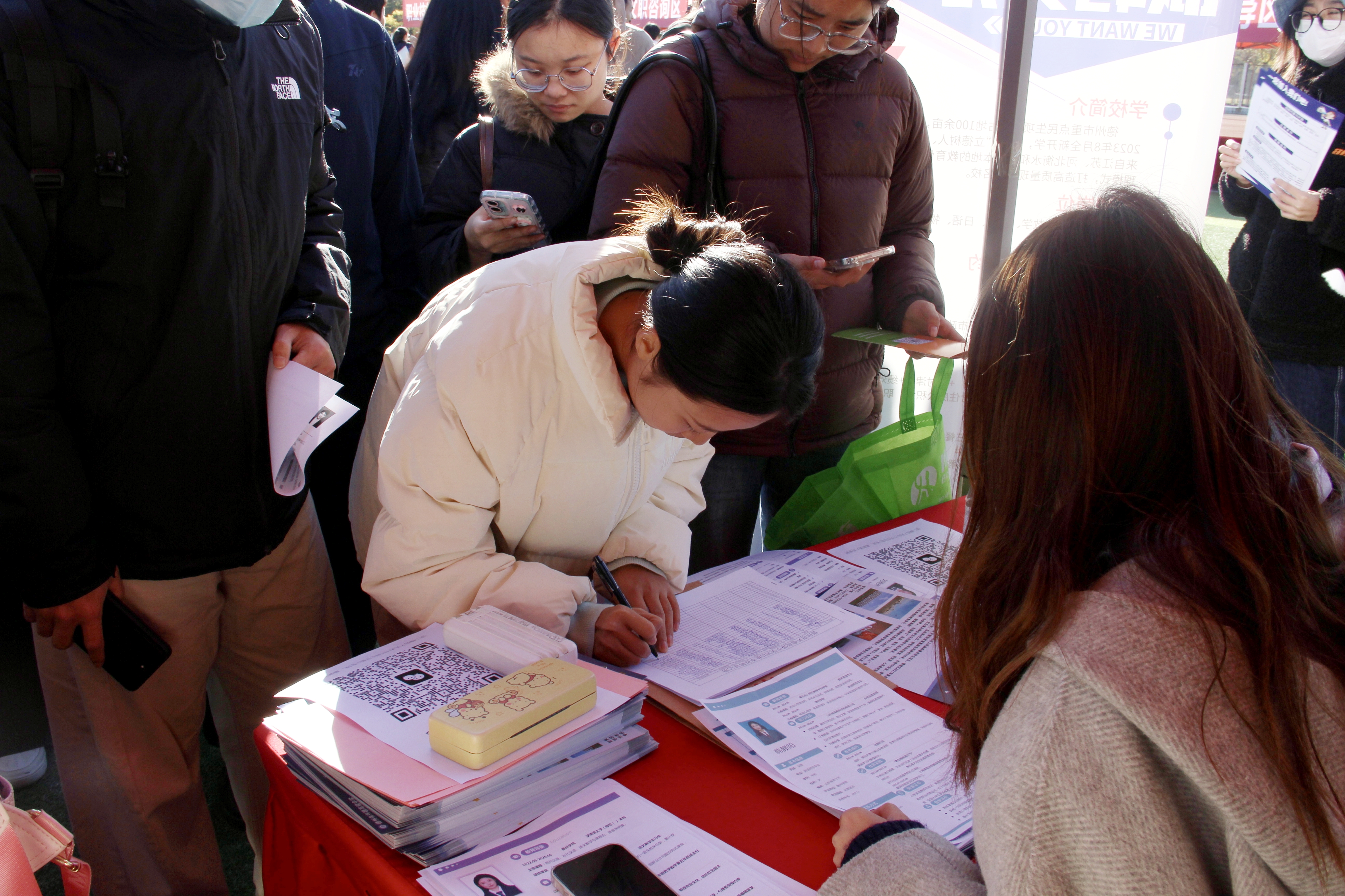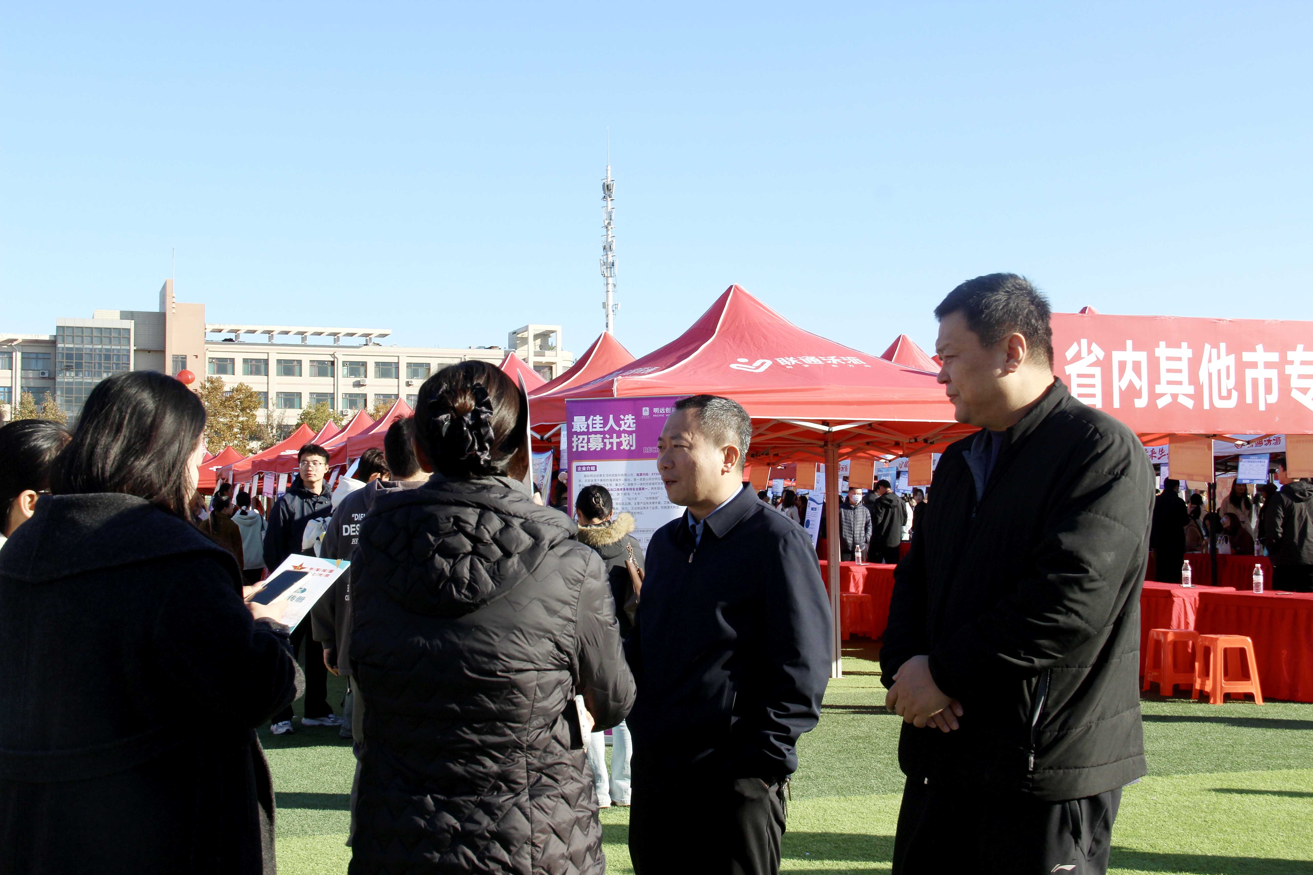 招聘会期间,操场内求职员工人流密集,随处可见积极参与求职的身影。同学们手持精心准备的简历,主动与用人单位沟通交流。面对同学们的咨询,企业招聘负责人详细解答了岗位职责、晋升路径、薪资福利等问题,同时结合行业发展趋势为毕业生提供职业规划建议。部分企业现场设置初筛环节,公司员工结合专业所学与实践经历,充分展现了自身的综合能力,有效提升了求职对接效率。